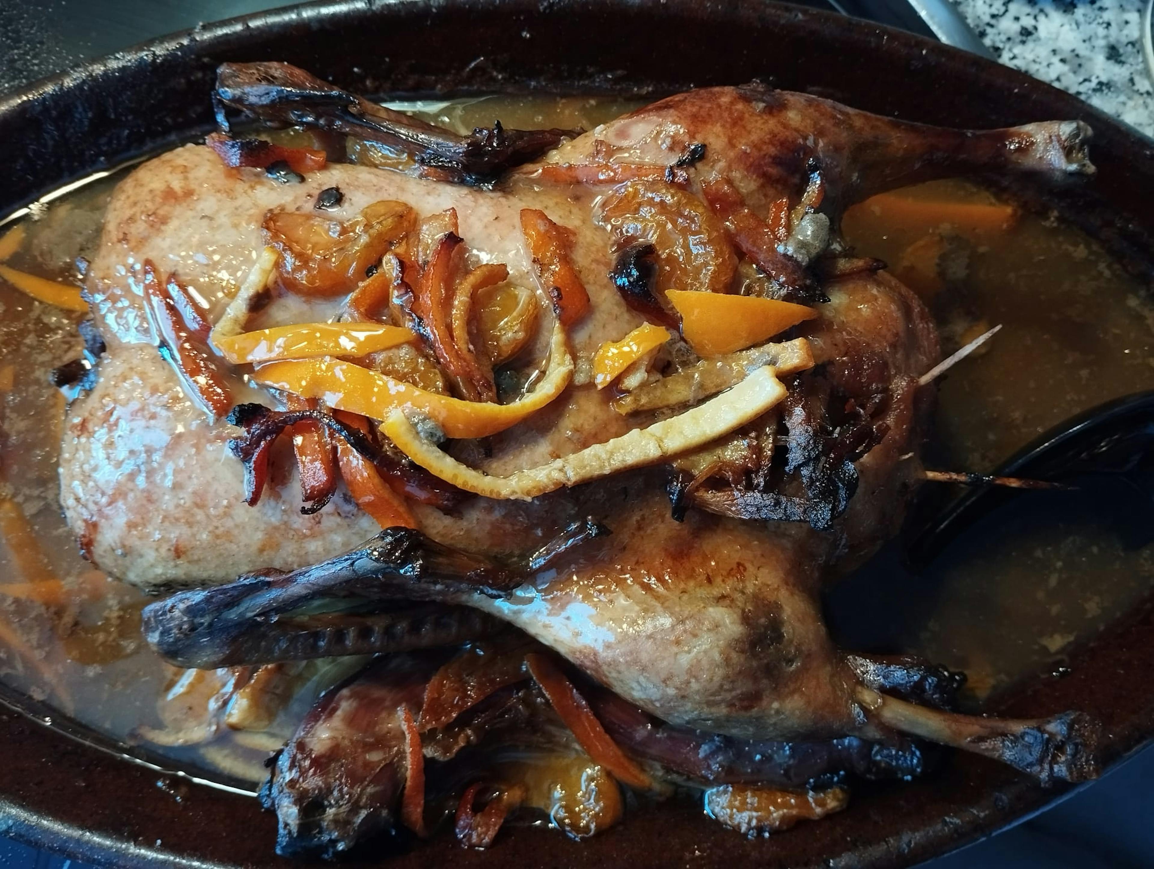 - Horneamos durante aproximadamente 1.5 horas. A mitad del proceso, regamos el pato con sus propios jugos y cubrimos con papel de aluminio para evitar que se dore demasiado.