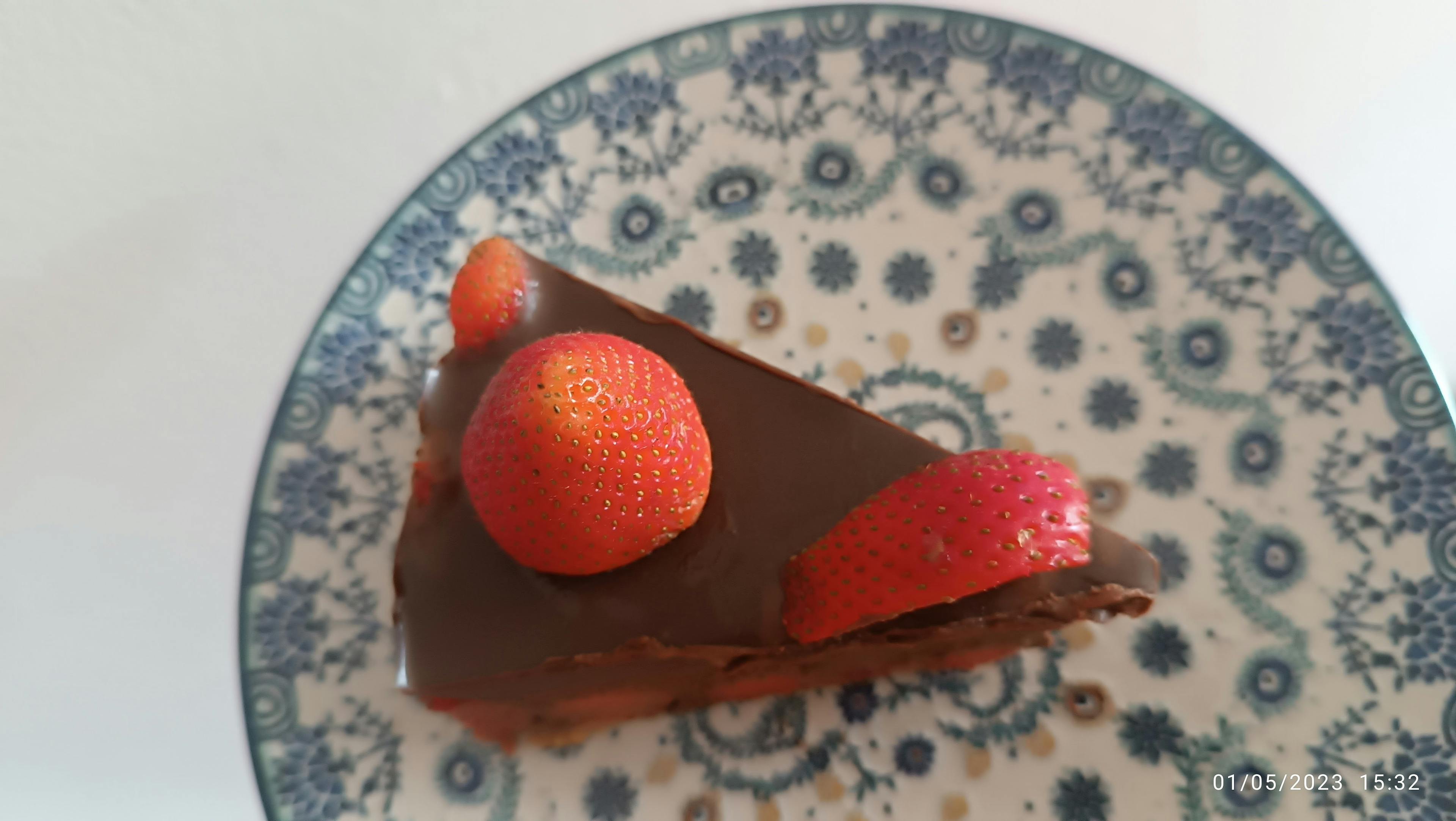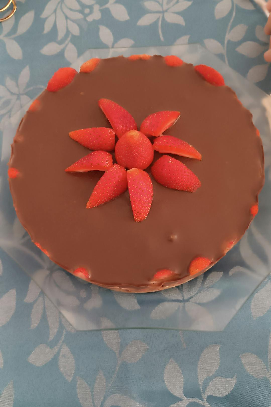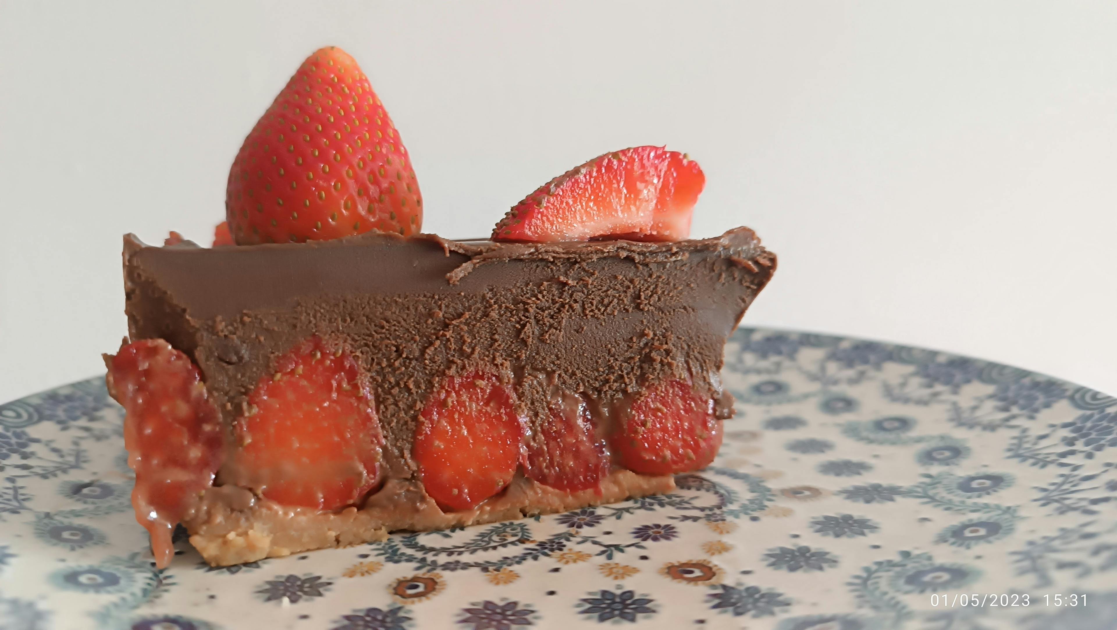 -Desmoldar la tarta y decorar con las fresas reservadas.