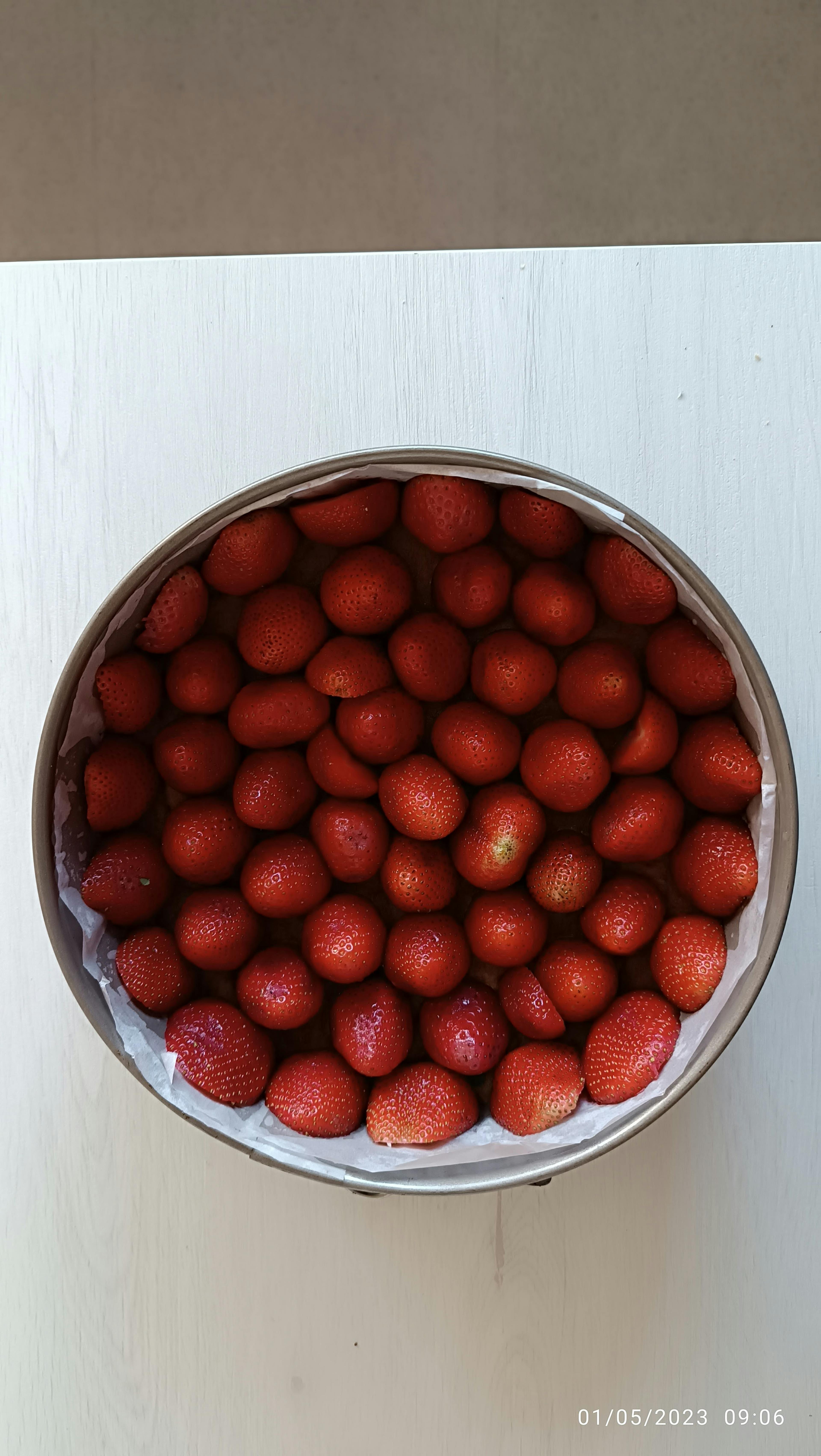 -lavamos las fresas y cortamos el tallos, reservamos 3 fresas 🍓 para decoración .Cortamos 10 0 12 🍓 por la mitad y las colocamos sobre la base de la galleta ( dejamos la parte interior para fuera) bordeando el interior del molde , ponemos las fresas enteras en el centro de la tarta,cubriendo toda la base.
